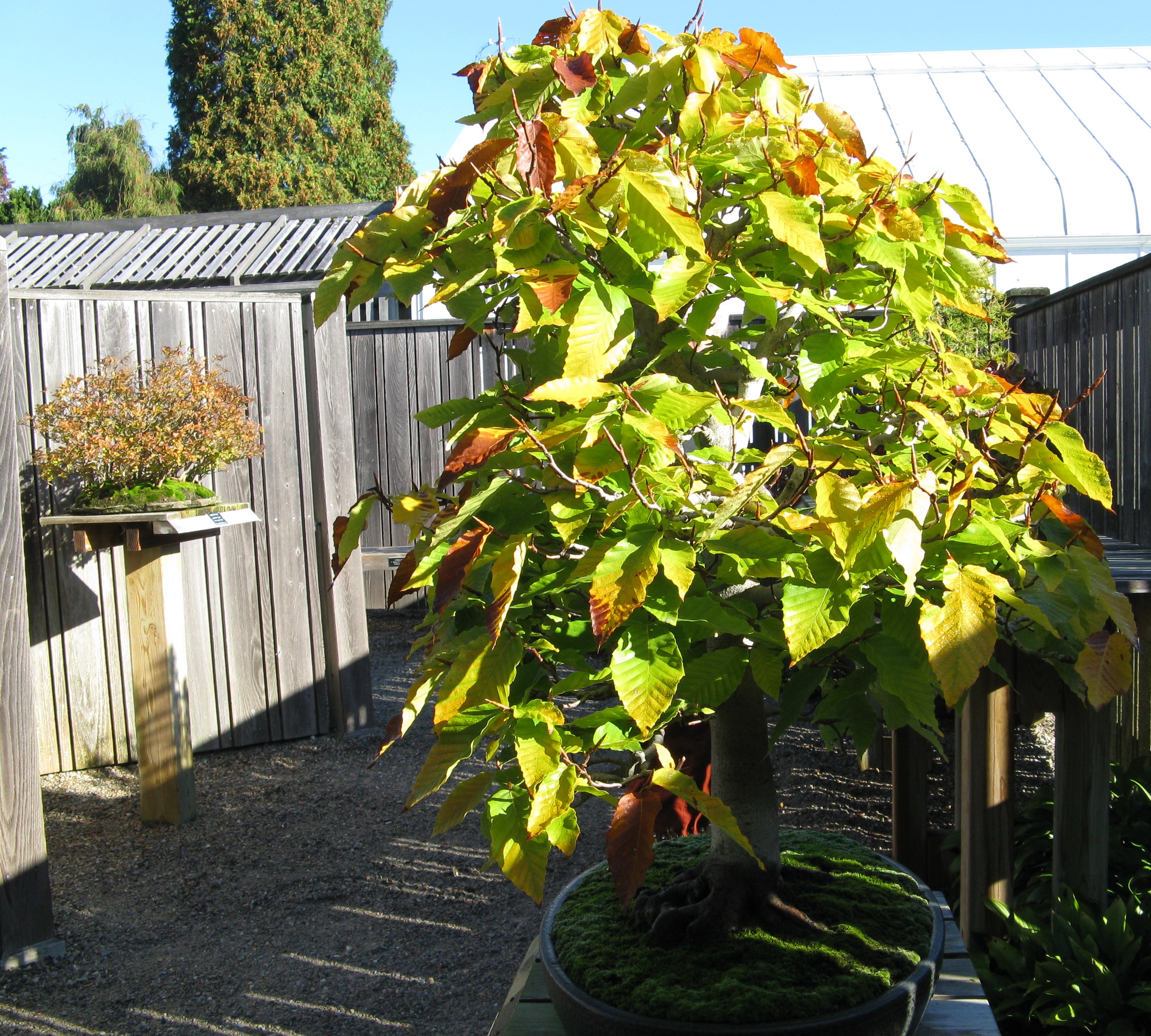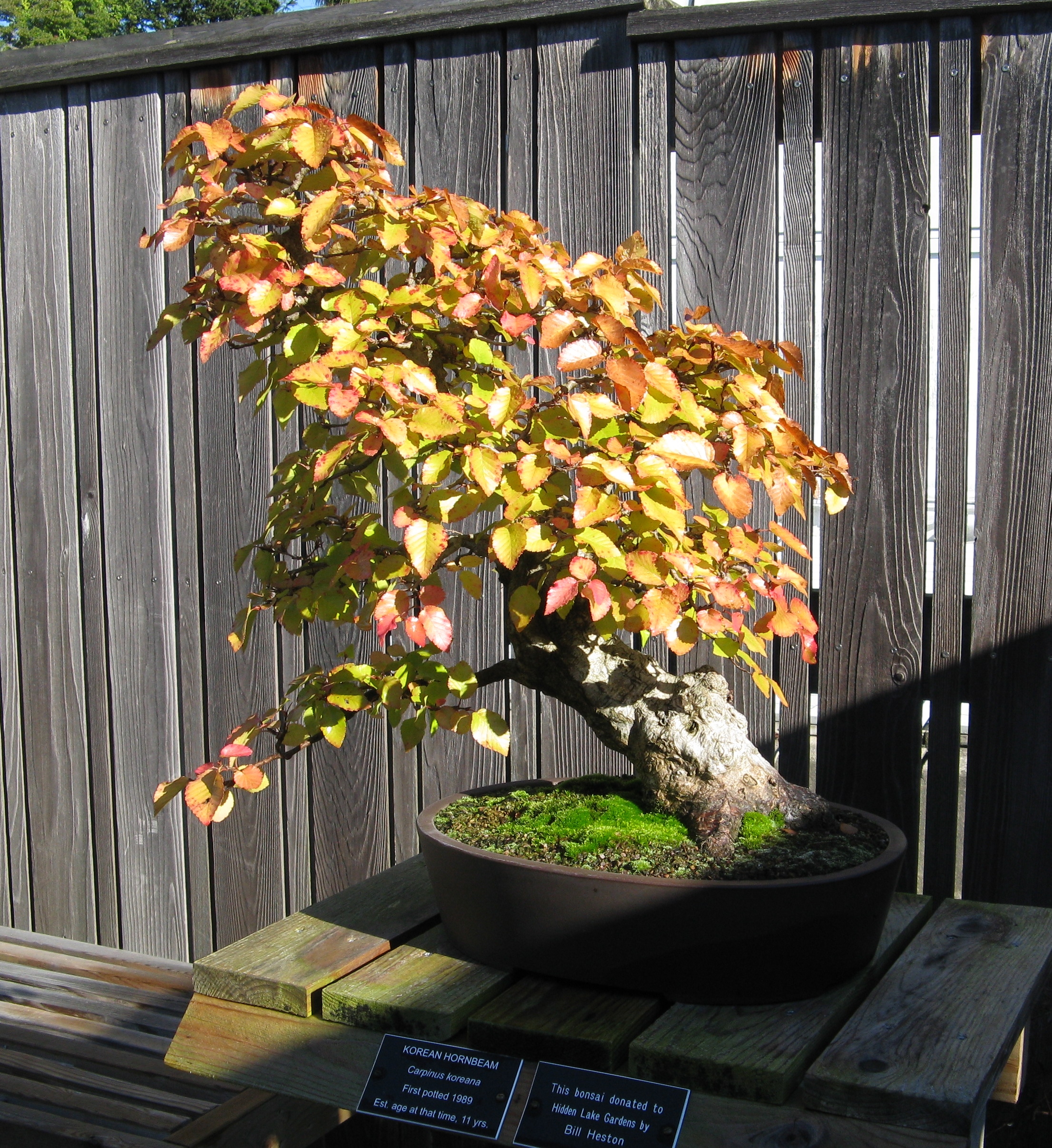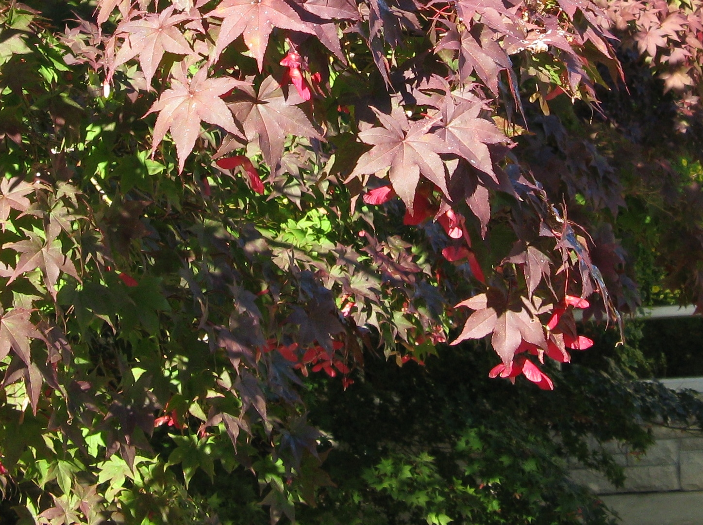 Stella and I were fortunate to have a chance to visit Hidden Lake Gardens on Oct 10, when early fall colors and a sunny day made the bonsai spectacular! An added treat was seeing Jack Wikle there and having him show us a photo scrapbook of some of the specimens in their earlier lives. (Google this charming retired education director of HLG for expert articles on growing bonsai and on the conifer collection. Better yet, sign up for classes/tours he still teaches.) Hard to believe some were nearly the same size and not looking much younger in 1985! The next couple of weeks will be fantastic for an afternoon drive through the arboretum as well as seeing the bonsai collection before it is stowed away for winter. At the entrance to the conservatory we loved the parsley and coleus border as such a fine textured contrast to the huge hardy banana leaves behind them, and the jewel red tones of dangling Jap maple seeds as we approached the door.