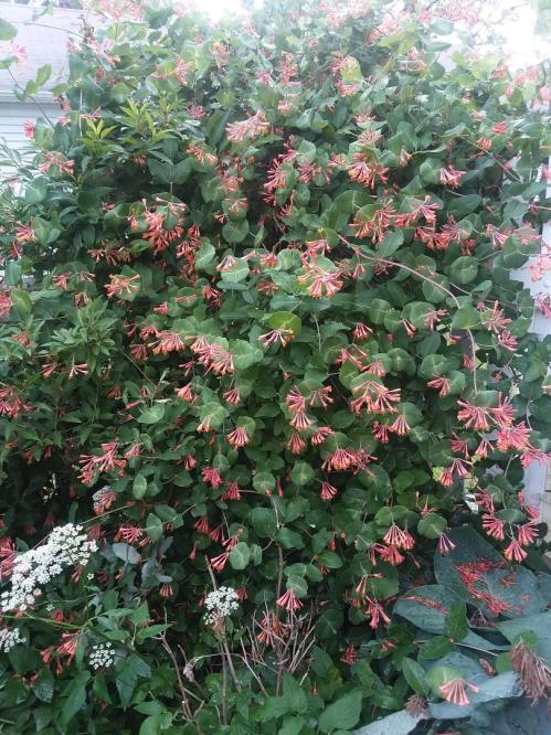 Excellant nectar source for Humming birds, it also is a great cover area for nesting birds. Currently a black birds nest is within the abundant foliage and blooms.
