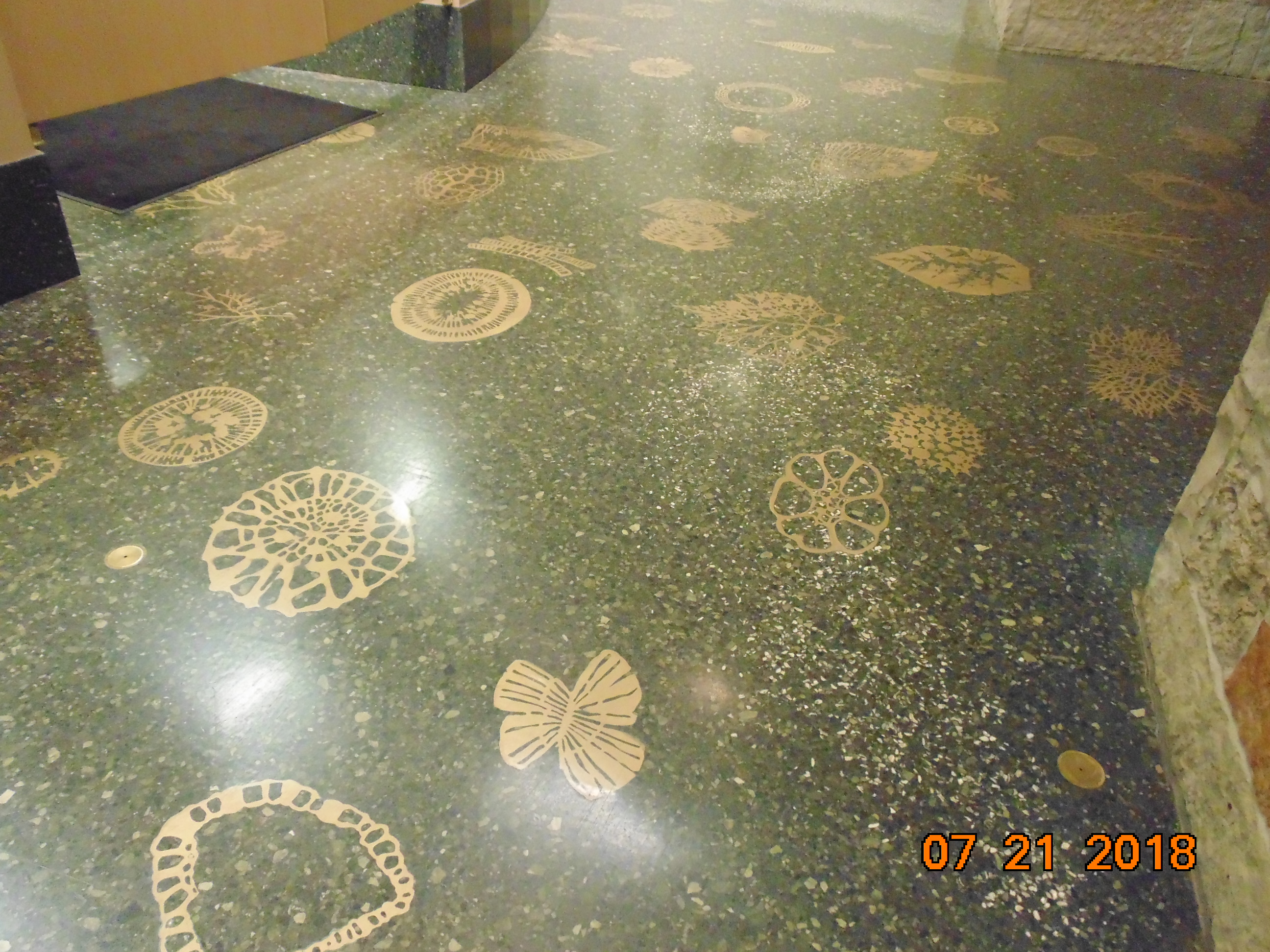 Outdoors, the plants are chosen to set off the sculptures, often enclosing even the larger works in an outdoor garden room of green tree and shrub walls with various appropriate groundcovers. Even the terrazzo floor in the conservatory is considered a sculpture with specially colored stones and mother-of-pearl fragments setting off the many imbedded bronze designs that suggest a “forest floor” under the canopy of the concrete “tree” forms that support the roof.