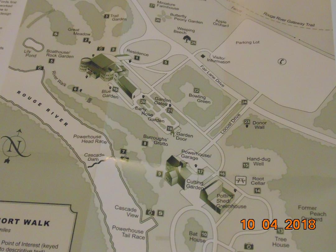 The tour of the grounds started with the new grand entry, the powerhouse/garage-cutting garden with the adjacent potting shed,& greenhouses. The property abuts the Rouge River-Jensen used the river to create a dam needed to produce hydro electric by the powerhouse. Today, the restoration includes creation of a stepping process beside the dam for fish to move up stream to spawn.