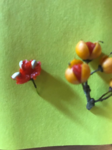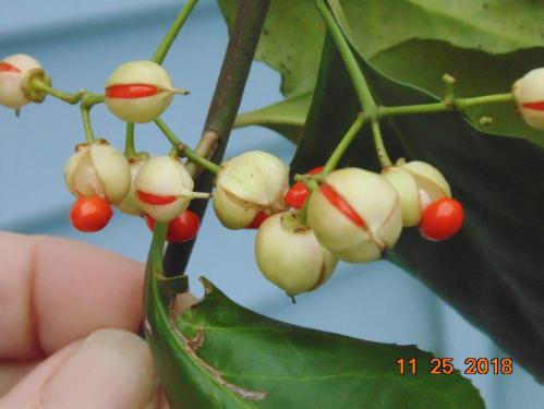 In the native bittersweet-each seed is enclosed by a bright scarlet fleshy aril–not much different than the other two plant types.