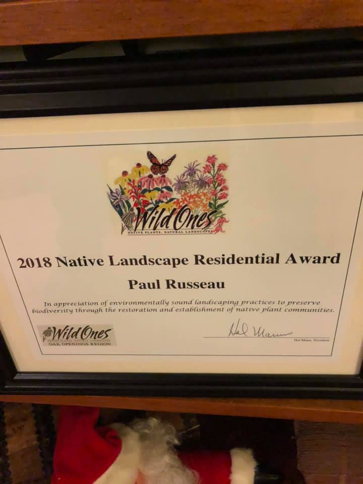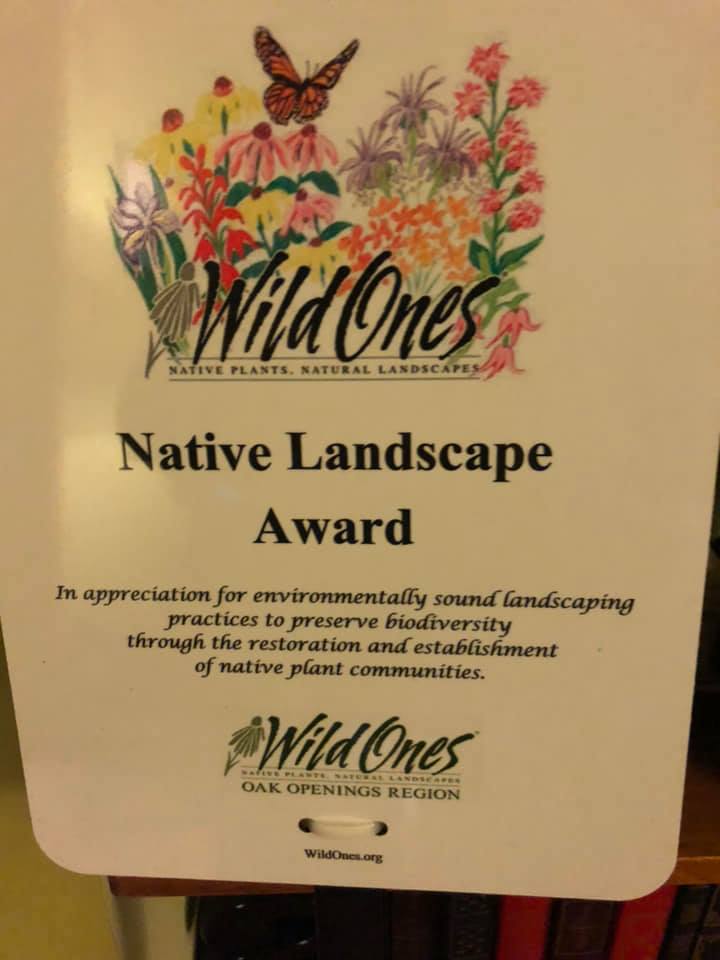 The award, was presented to me by the Wild Ones Oak Openings Region Chapter. One of the activities of the chapter is to present student, business, public agency, and residential landscape awards. The Oak Openings is a globally-threatened ecosystem of northwest Ohio and southeast Michigan.