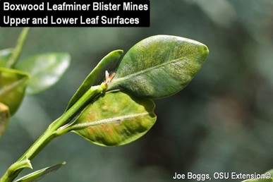 However, a close examination may also reveal the telltale blister-like leaf symptoms caused by the boxwood leafminer (Monarthropalpus flavus). Leafmines may be found throughout the plants although the highest concentration often occurs on foliage at branch tips.
