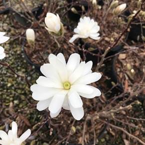 The two most common in the landscape are Star Magnolia Magnolia stellata, which has a white flower, and Saucer Magnolia Magnolia soulangiana, which has a pale purple flower.