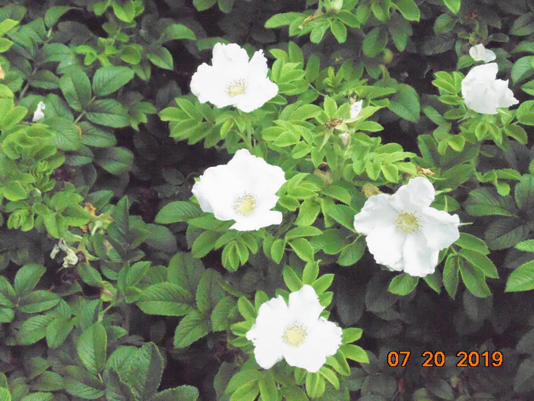 like the hedge of white rugosa roses on the way to the color garden where she usually volunteers, when she is not helping with the plant records.