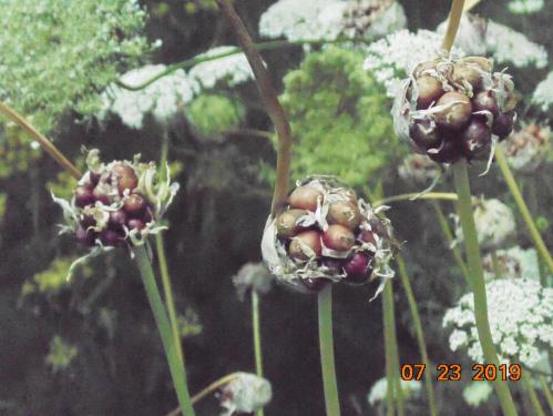 Garlic heads reach up on stiff stalks in defiance of any mid-summer breeze
