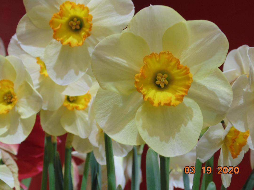 DAFFODILS- relate to larger flowering versions; the trumpets being long, in various colors.