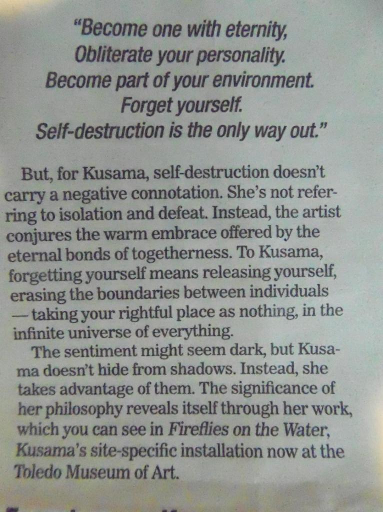 I would say-I believe I was fortunate and experiencedfully the intent behind Ms. Kusama’s exhibit.