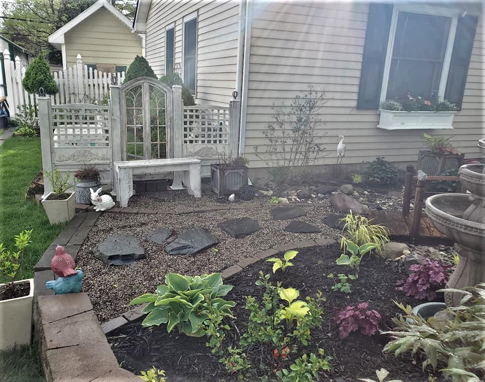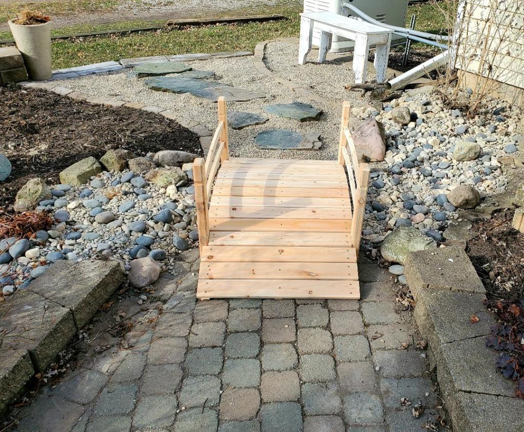 I started with a pathway of pea gravel and laying out an idea in my head for a dry creek bed. I still had an odd transition between materials. I decided to add a little bridge over the dry creek bed. A few flagstones were added to make a walkway. I eventually discovered that this bridge was too odd to walk over and replaced it with a longer one with less pitch.