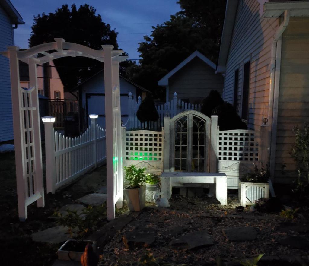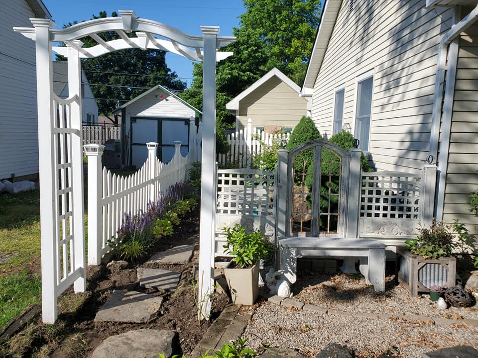 Added a small bench. I often have seating around my garden so I can take breaks after hard work. Now to hide that generator. I came up with this idea after seeing a selvage piece. I purchased two flower boxes with trellis…but they didn’t hid the top of the generator. So I reconstructed them and added a bit of decorative detail. Now that monster doesn’t show so much. The panels are removable in case maintenance needs done on the generator.