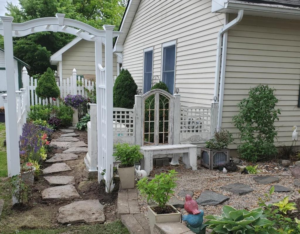 Now to add the arbor and 4 climbing roses onto it. Two Eden, and Two Zephirine Drouhin Roses. I also scored some flagstones (large ones…very heavy) on Facebook Marketplace for $2 each.