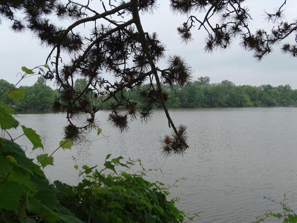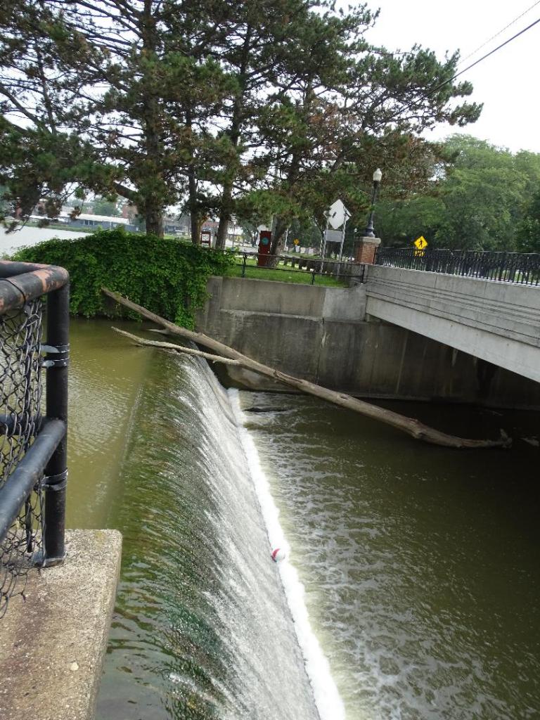 Slowly walking along the lakefront I come to a point where the lake water rushes over a dam,