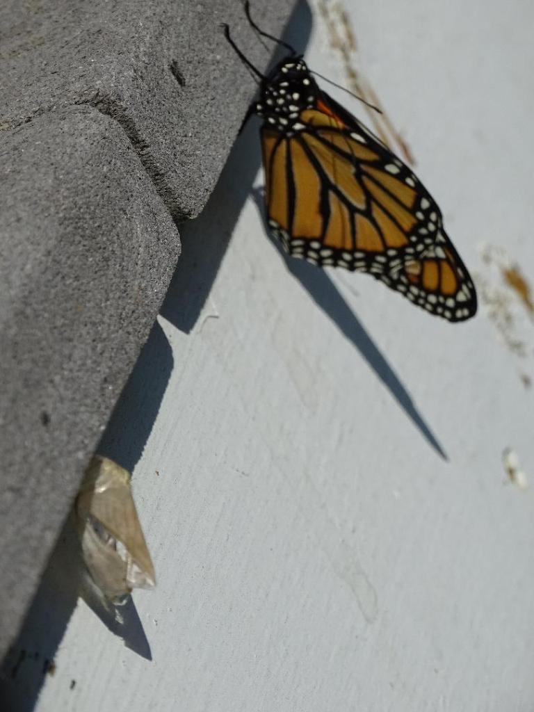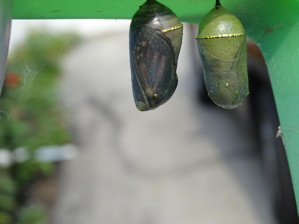 ABOVE: can you see the wing inside—- needless to say.neither of the twins, hatched; for some reason, the butterflysuffered a virus or other issue which destroyed it beforeit could. BELOW: success!!!! newly hatched note its chrysalis