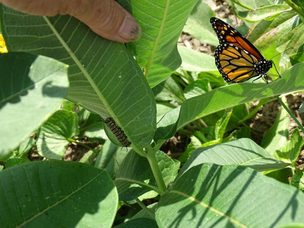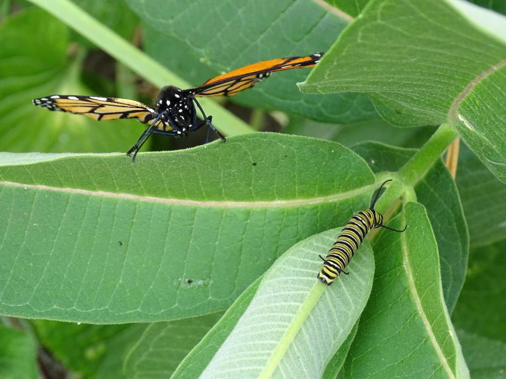 ABOVE: a young caterpillar munches away while a newly hatched Monarch dries its wings on the same milkweed plant.