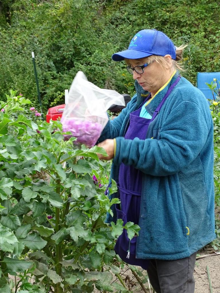 Above: Gerri removes a protective sleeve from one of her largest blooms. She utilizes organic products & techniques; such as companion flower or vegetable plants to help control insects and diseases.