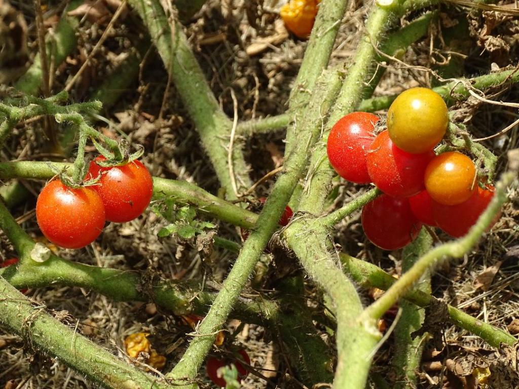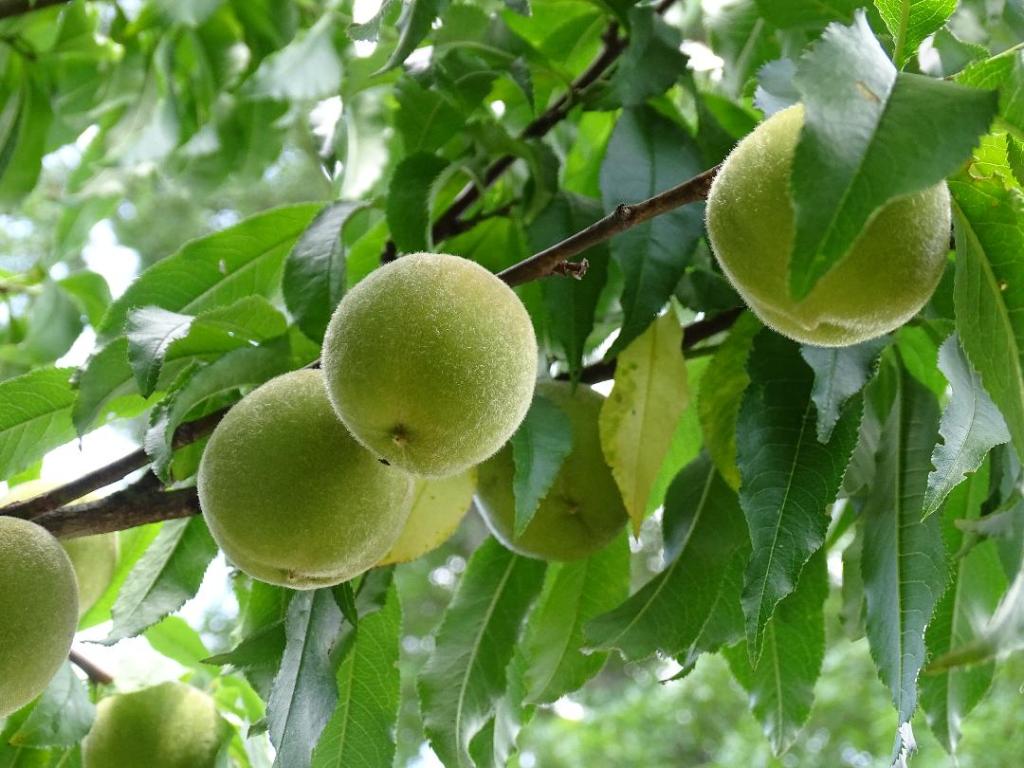 fruit trees (peach, apple) and vegetables (tomatoes, pumpkins)