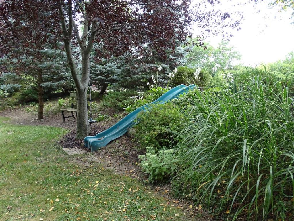 a play area for children (or adults??) who visit here. The path fully opening to expose an expanse of grass with scattered areas of defined groupings and outlined by a raised, mulched bed