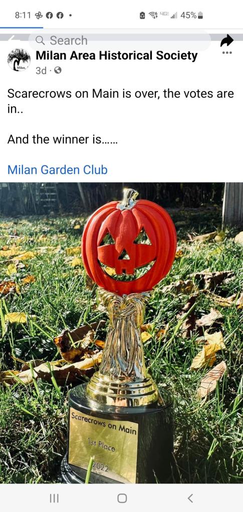 Thanks to ALL who voted for the 2022 Milan Garden Club Scarecrow! We won!