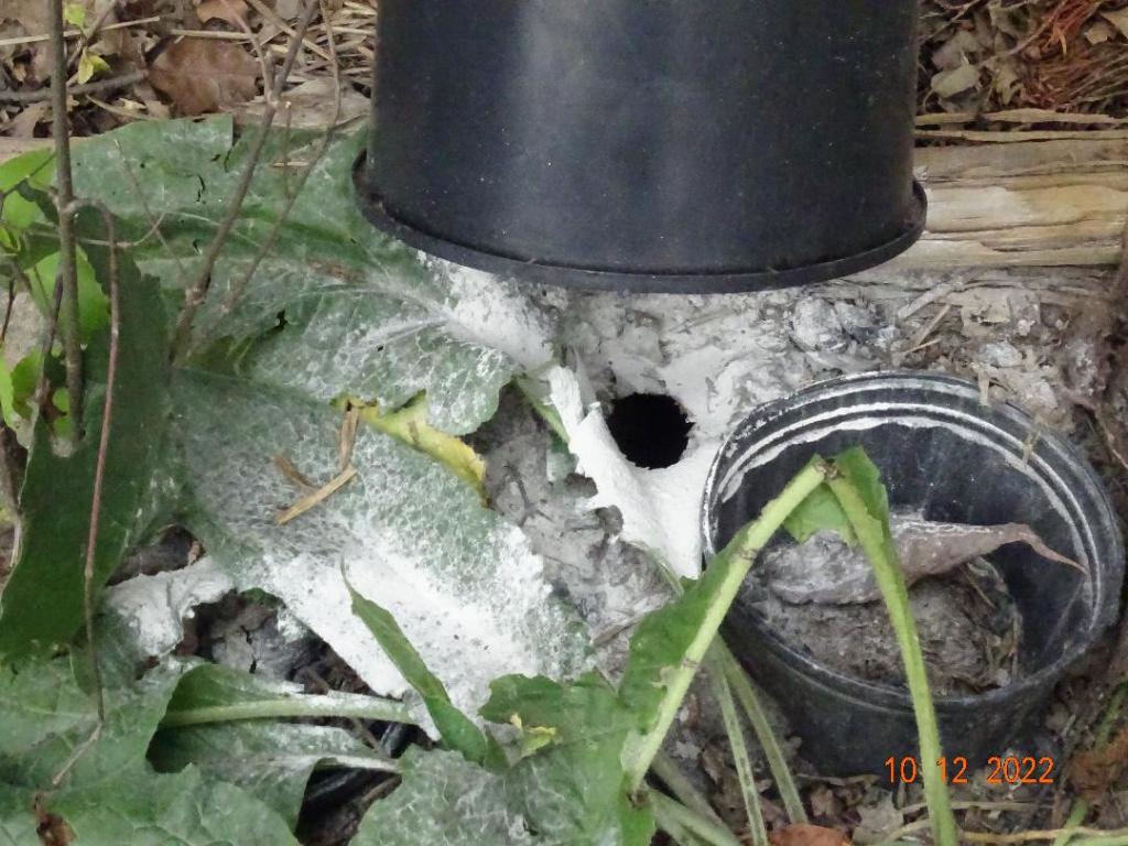 Encounter #3: pulling plants during a pre-fall cleaning-under the foliage, a neat little hole to another dimension?!!! Finally! Proof that gnomes exist?? However, a flurry of small flying “bees” sent me running. That nite-POOF-POOF!!