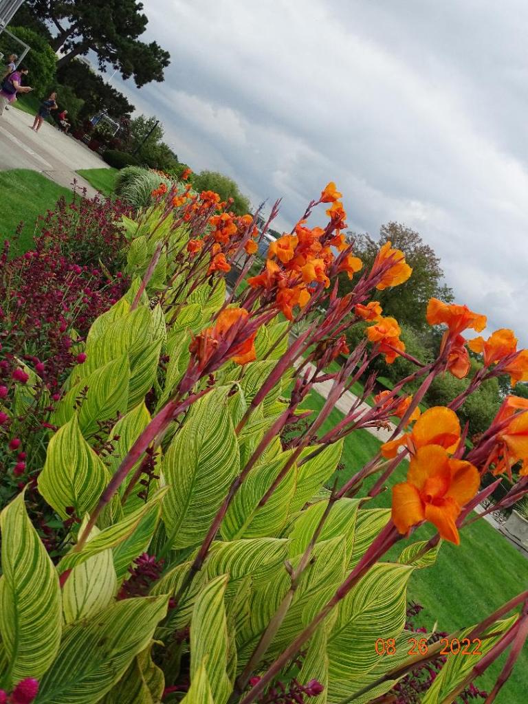 Upon entering the garden, we are greeted by an in your face HOT orange -striped leaf canna lily!!