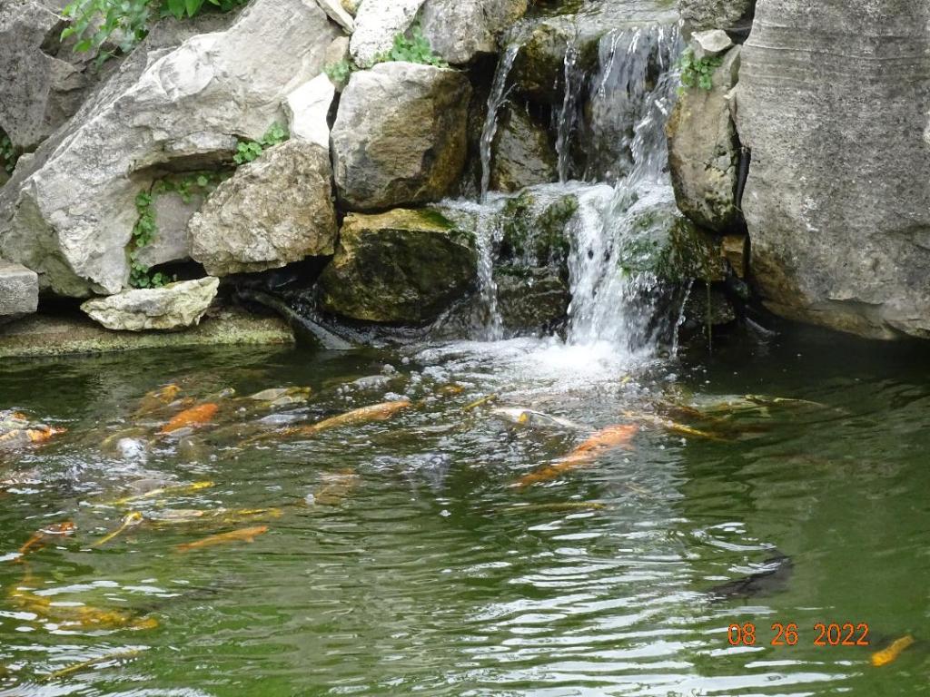 In a small outdoor courtyard we find a pond, waterfall and fish-along with native plantings.
