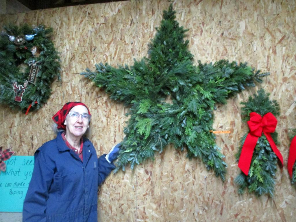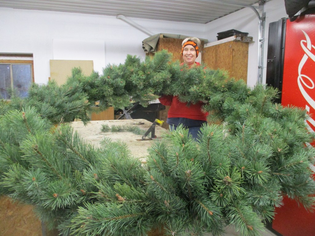 Karen Hehl & Chris Eddolls enjoyed spending the month of November working at Matthes Tree Farm (Lulu Rd., Ida, MI), making Xmas wreaths and roping. Here is Karen behind her 6-foot diameter, hand wrapped wreath. Look for it is gracing the MCCC building! That’s Chris next to a star wreath; one of several unique shapes she makes (star, candy cane, cross, xmas tree, & swags). Happy holidays to all!