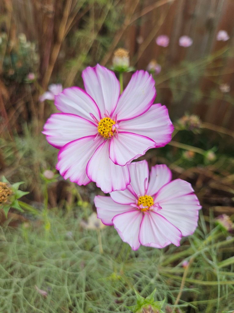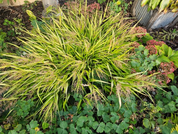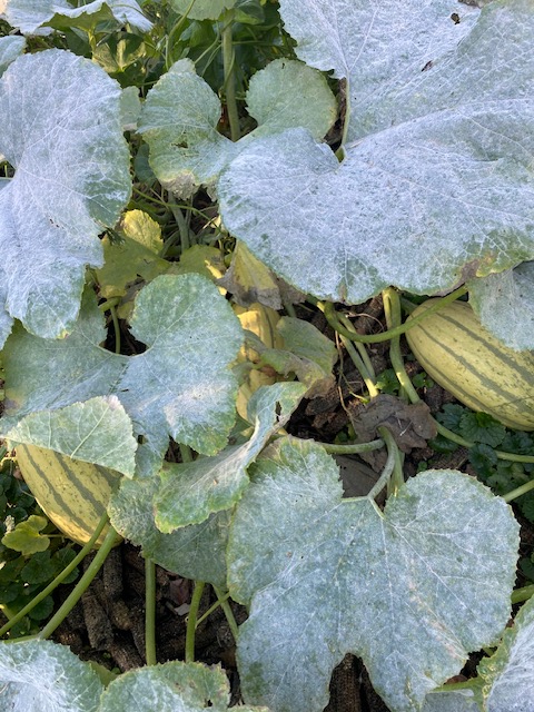 This year my compost pumpkin seems to be a cross between pumpkin and delicata squash, both of which I grew last year. The fruits are larger than footballs and so far do not have the eating quality of the squash. The compost is in the shade, which has favored powdery mildew.