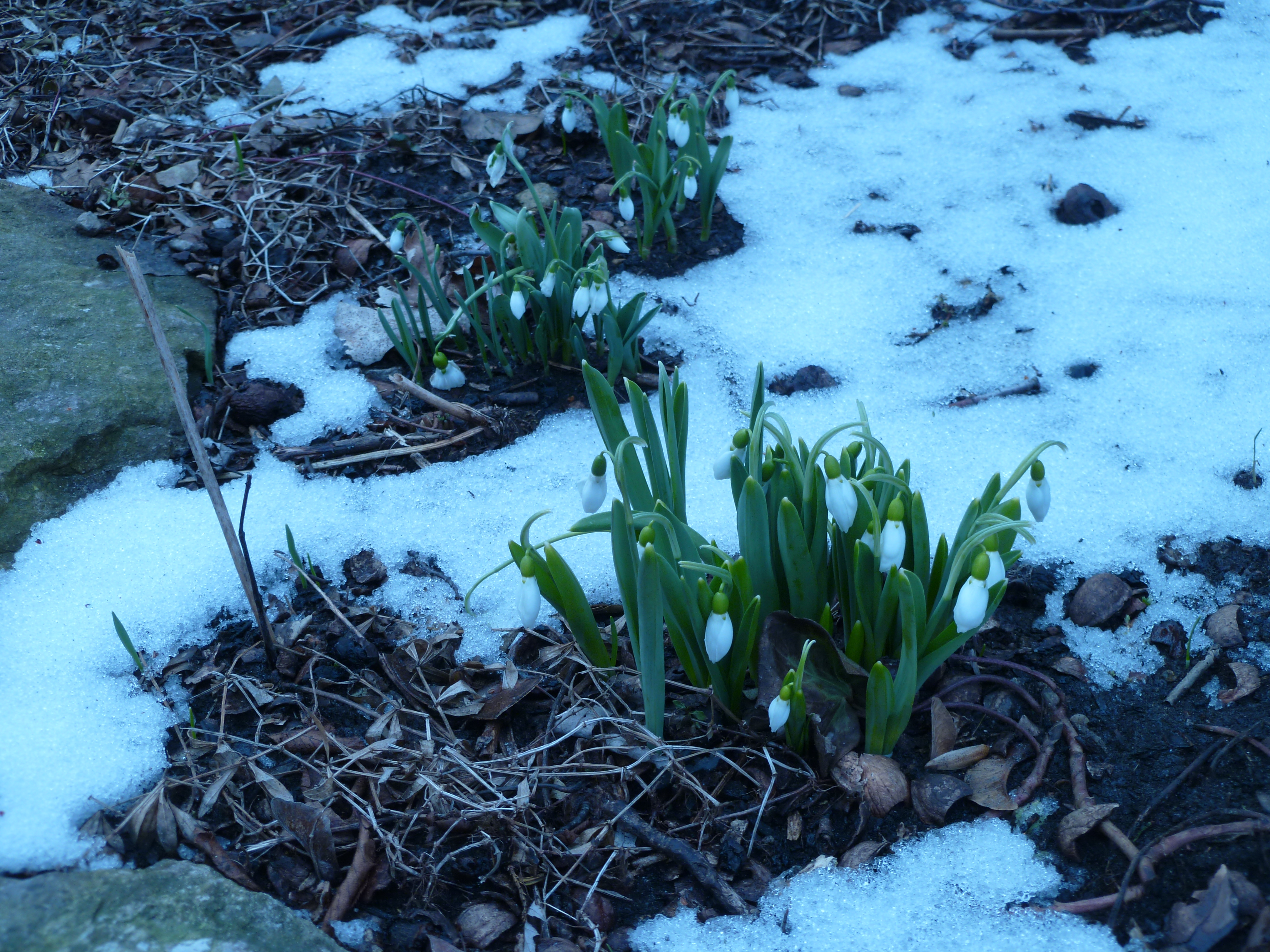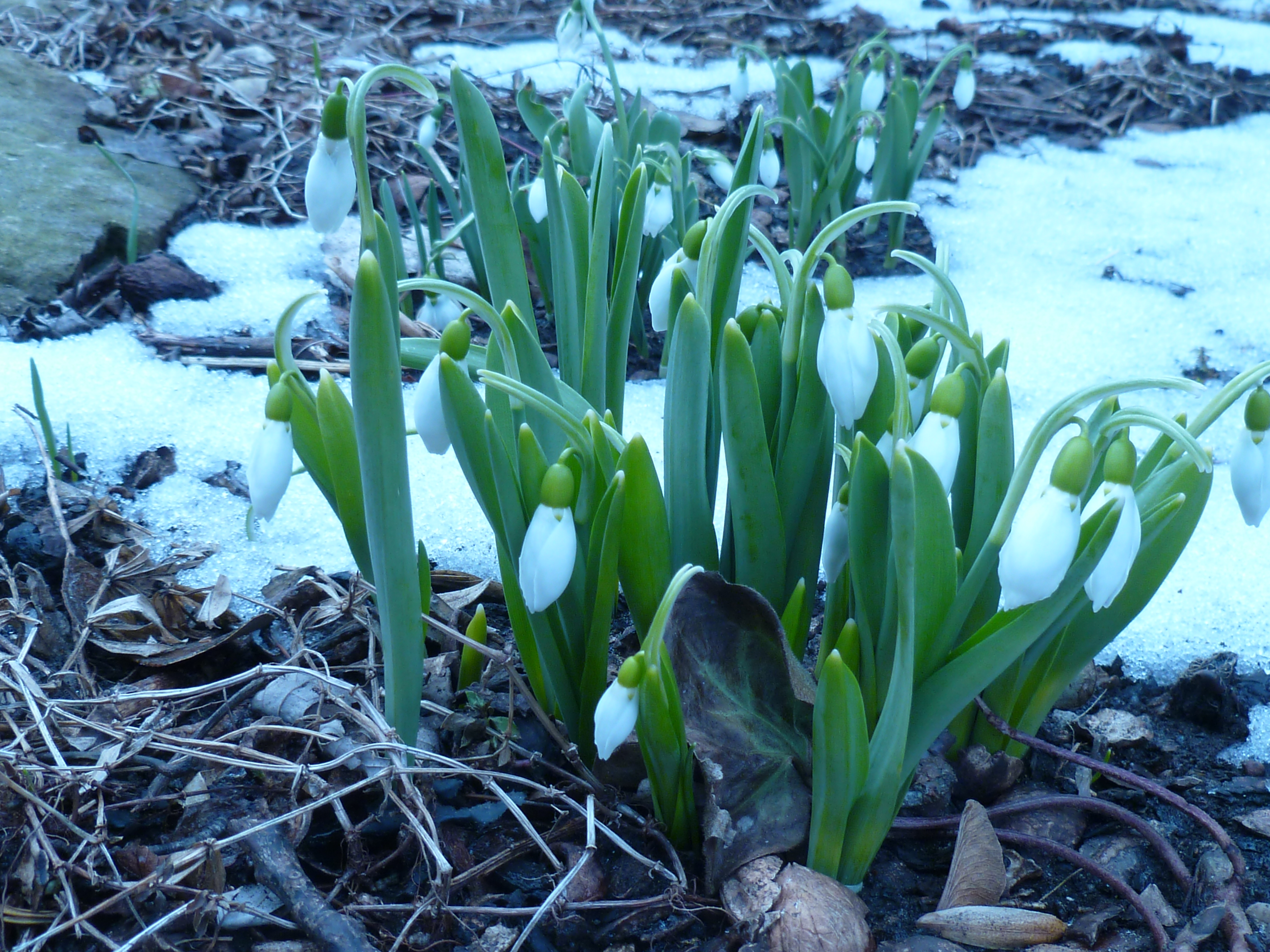 The first flowers of Spring blooming in my garden are hardy bulbs, Galanthus nivalis, the common snowdrop. Snowdrops poke through the snow in late February and bloom for a few weeks. They grow in clumps, seldom need thinning, and eventually create drifts as the seeds fall to the ground and take hold. They are perfect for naturalizing.
